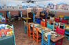 The interior is filled with brightly colored furniture and murals celebrating the folk traditions of Mexico. Leon said he went to Mexico to select the hand-carved and hand-painted furniture.
