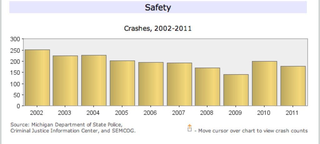 The percent of total crashes from 2007-2011 that have been fatal is just 0.2 percent. While 1 percent have yielded incapacitating injuries, 16 percent have caused injury and 83 percent caused only property damage, according to SEMCOG data.