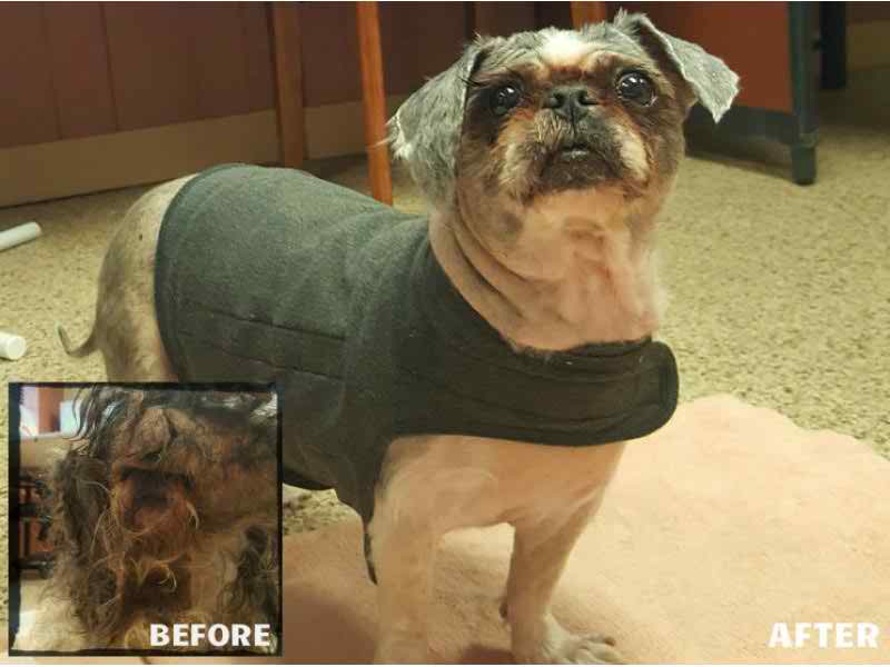 Dr. David Balaj, a veterinarian at nearby Harper Woods Veterinary Hospital, shaved 2.5 pounds of filthy, matted hair from the 15-pound dog the rescue group named Dakota.