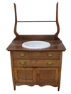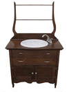 My vision for this stunning piece slowly took place as we began the tedious process of stripping and refinishing the original oak finish and applying a dark walnut stain, which brought out the wood's natural grain. One of the harp-shaped towel bar was missing, so we replaced it. While the drawers were unusable because of the sink, the bottom of the cabinet provided adequate storage. The nickel faucet was the right choice as it gave this piece the"bling" it needed and matched the new handles perfectly. It was a stunning piece of furniture, redesigned to fit today's modern needs, yet still maintained the quaint antique charm.