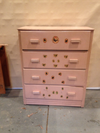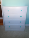 This tiny dresser likely belonged to a teenage girl back in the 1960's. It was painted peach and the drawers had stickers on them. It definitely needed a new look. The back was in poor condition and the sides were loose, so we had to reinforce it to make it strong before anything else could be done. Once the structural issues were resolved, we stopped it and gave it a good sanding, then opted to paint it bright white. I selected turquoise and polka dot knobs for a modern, fun look. The finished dresser is a far cry from the original peach 1960's dresser. With a fresh new look, this dresser shines!