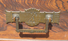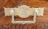 Once we began working on it, it was apparent that someone had already tried to remedy the worst crack, which was on the left side of the dresser, by nailing a long board on either side of it. This was probably done long before they had the pipe clamps used by carpenters nowadays. We knew that that board had to be removed so we could properly fix the dresser using glue and clamps, so Jim carefully removed that strip of wood and with glue and clamps, pulled the two sections together as far as they would go. After it had dried, he replace the inside strip with another one, using screws to fasten it. That crack wasn't going anywhere. He followed the same process on the right side of the dresser, but luckily that crack wasn't as visible as the other one and hadn't run the entire height of the dresser, so it was easier to repair and almost invisible when completed. Jim also replace the very thin trim molding at the top of the dresser and cleaned all the handles until they sparkled. We discovered them to be made out of brass, not uncommon for a dresser of this era as brass is easier to work with when creating a fine detailed stamped design such as this.