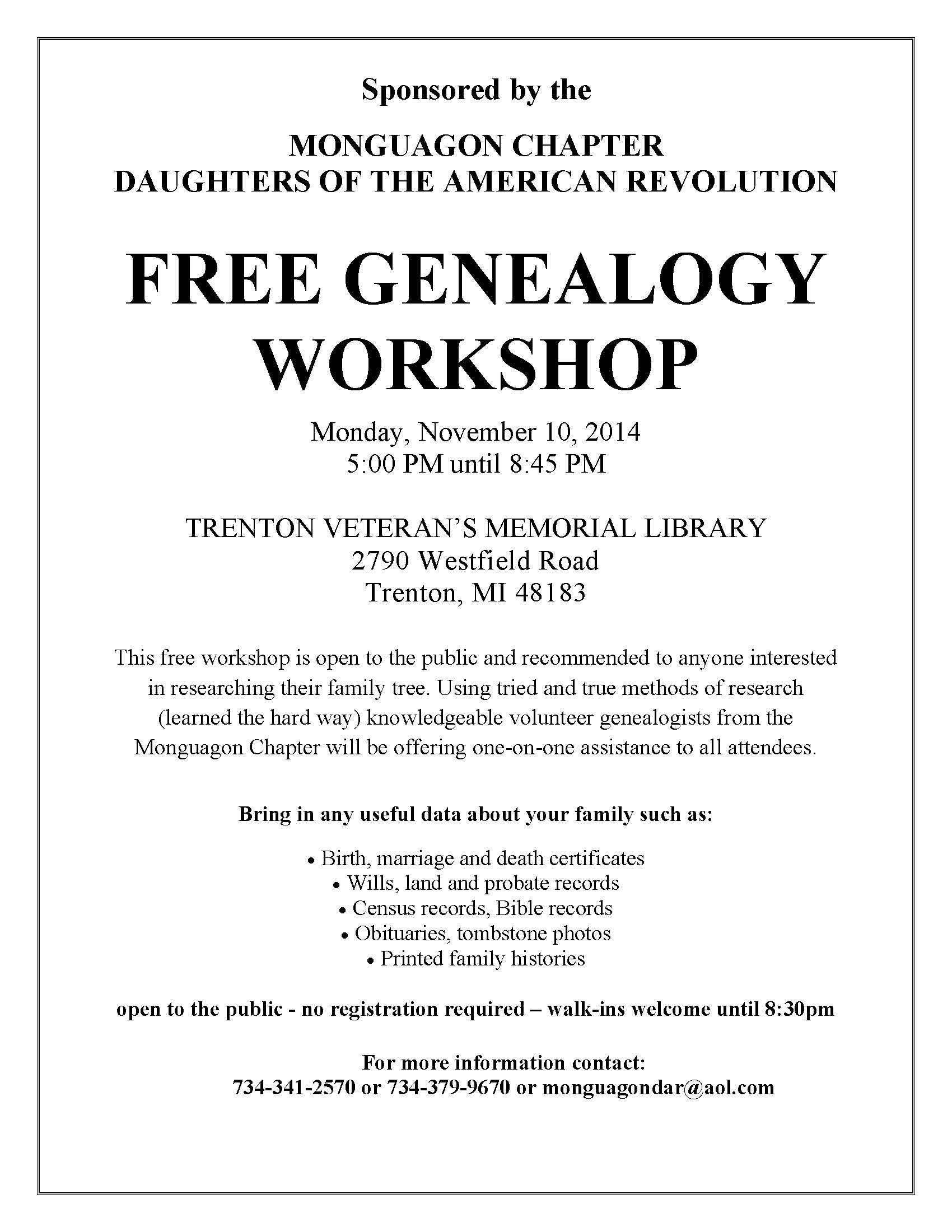 GENEALOGY WORKSHOP - Monday, Nov 10., 5:00pm to 8:45 p.m. Trenton Veteran’s Memorial Library, 2790 Westfield Rd., Trenton, MI 48183. This free workshop is open to the public and recommended to anyone interested in researching their family tree. Using tried and true methods of research (learned the hard way) knowledgeable volunteer genealogists from the Monguagon Chapter will be offering one-on-one assistance to all attendees. Bring any useful family data such as birth, marriage, death records, wills, land and probate records, Census records, Bible records, obituaries, tombstone photos, or printed family histories; call 734-341-2570, 734-379-9670 or email MonguagonDAR@aol.com. for additional information. This workshop is sponsored by the Monguagon Chapter National Society Daughters of the American Revolution.
