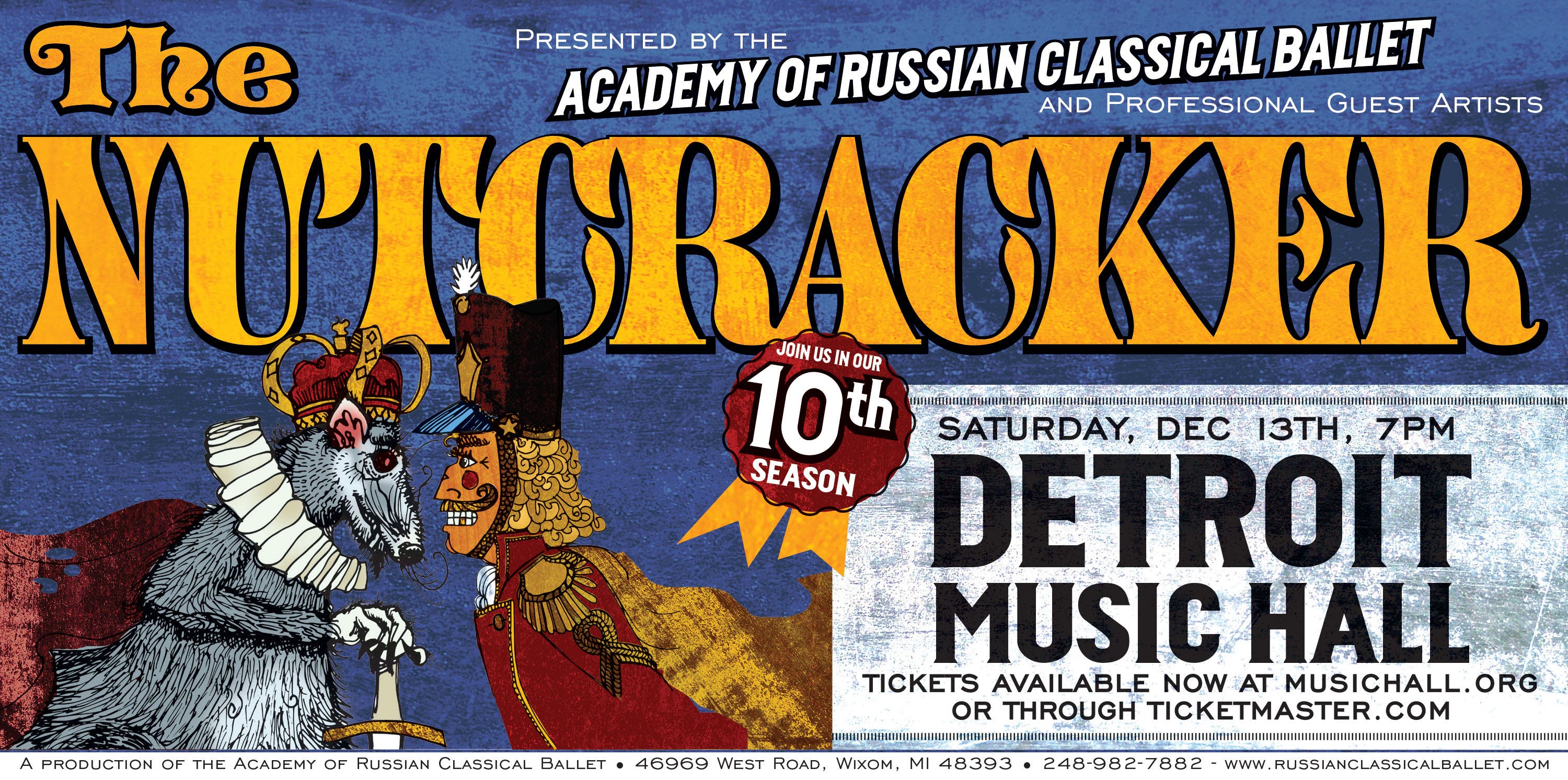 Join us at the Detroit Music Hall, to enjoy a truly traditional Russian rendition of the Nutcracker ballet with professional guest artists Cervilio Amador and Janessa Touchet, Principals of the Cincinnati Ballet. Presented by the Academy of Russian Classical Ballet, the guest artists will take the stage along with a cast of 80 local ballet students from Michigan and Ohio for this wonderful performance. This is the tenth anniversary of the Academy’s production. We are very excited to showcase talented Metro-Detroit ballet students alongside world-class professional ballet dancers on the historic Detroit Music Hall stage