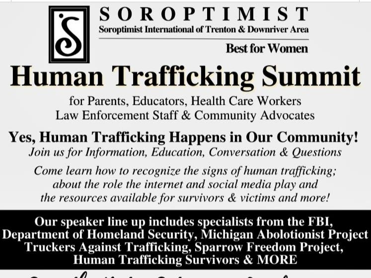 Soroptimist International of Trenton and Downriver Area will be hosting a Human Trafficking Summit on Saturday, April 9, at Summit Academy, 18601 Middlebelt, in Romulus. The day starts at 9:30 A.M. with coffee and donuts, includes a boxed lunch, and ends at about 2:30 P.M. The symposium is available FREE of charge but is LIMITED to 160 participants, so early registration is important to guarantee your seat. Register here: https://f8s.co/27sk