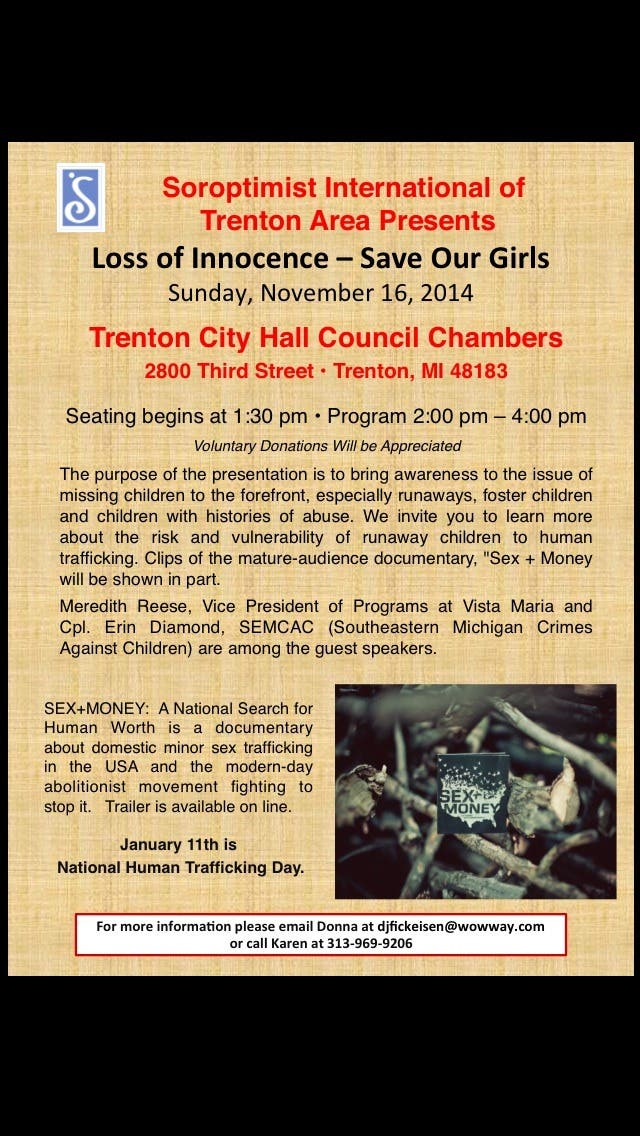 Clips of the mature-audience documentary, “Sex + Money, ”will be shown in part. Meredith Reese, Vice President of Programs at Vista Maria, and Cpl. Erin Diamond who is on SEMCAC (Southeastern Michigan Crimes Against Children) Taskforce are among the guest speakers. Attendees who fill out a contact information card will be entered in a drawing for a prize. There will also be a gift basket raffle. Vista Maria and Soroptimist International of Trenton Area will have displays of their organizations available to the public. Soroptimists worldwide work to improve the lives of women and girls through local and global service and donations. For further information, contact djfickeisen@wowway.com.
