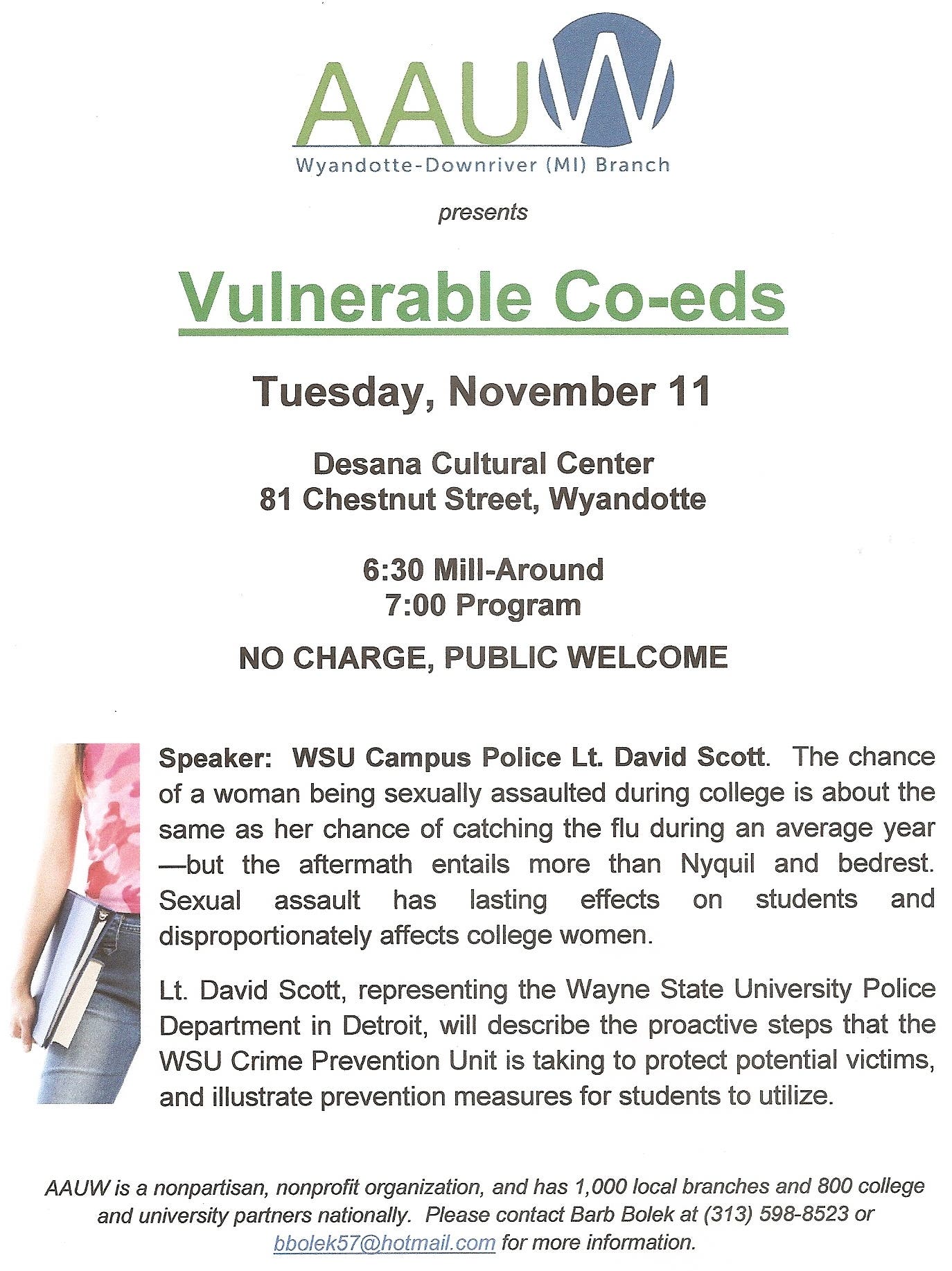 Join the local branch of AAUW Tuesday night (11/11/14) for a program dealing with campus security.
