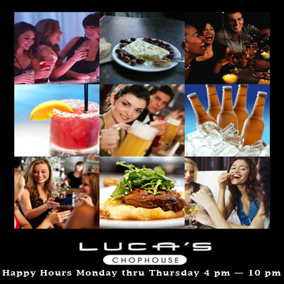 Monday through Sunday, 4 pm to 10 pm, everyone can be merry with the Luca’s Chophouse Happy Hour food and drink specials.