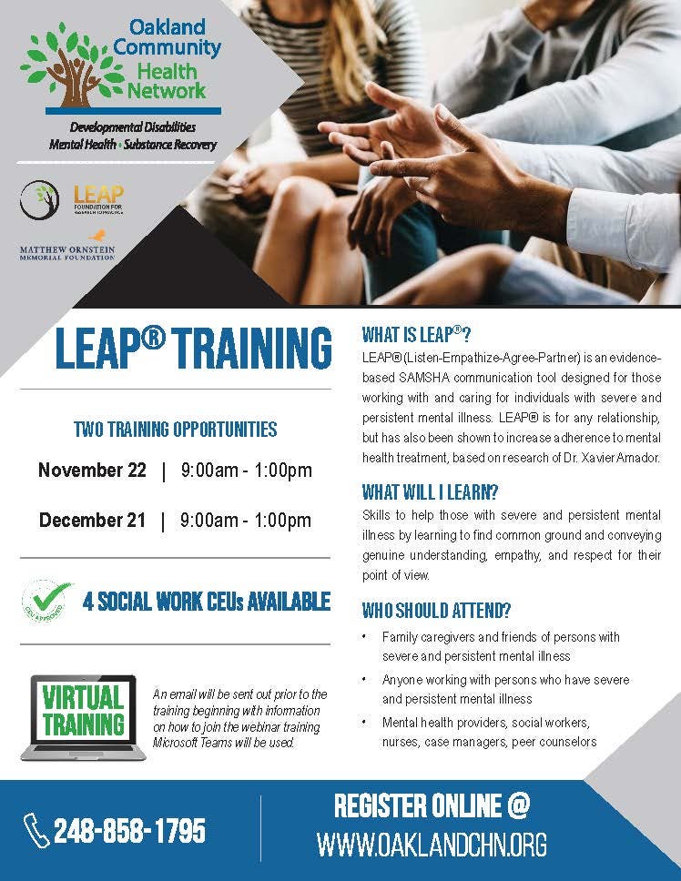 LEAP is a communication tool designed for those working or caring for individuals with mental illness. Join training on December 21st, 2021
