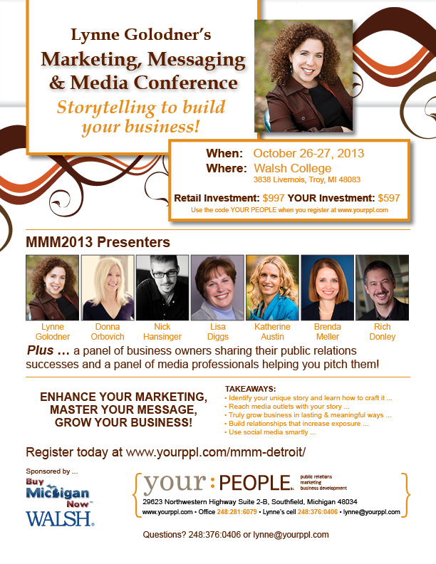 Marketing, Messaging & Media: Storytelling to Build Your Business (MMM) takes place Oct. 26-27, 2013 at Walsh College’s Troy campus. Sponsors include Walsh College and Buy Michigan Now, with a speaker roster involving Your People Chief Creative Officer Lynne Meredith Golodner, Source Movement entrepreneur Donna Orbovich, business coach Nick Hansinger, entrepreneur Lisa Diggs, Karma Yoga business owner Katherine Austin, Rich Donley of MCCI, Brenda Meller of Walsh College and more.