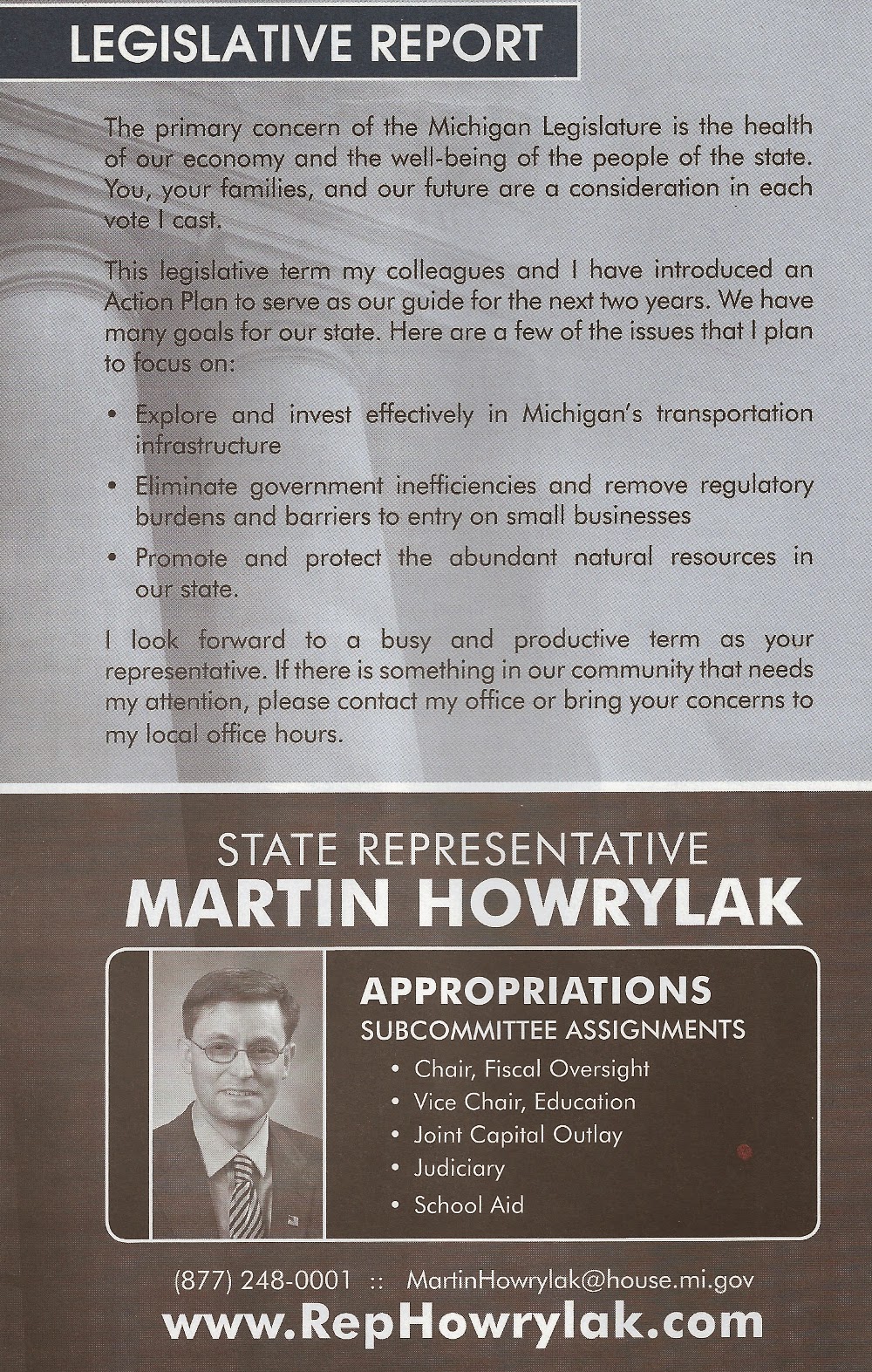First, over the last two years, Martin has been sending out “Legislative updates.” (On your dime, by the way.) These thinly disguised campaign mailers are designed to make you believe Martin Howrylak is earning his $71,000 a year salary.