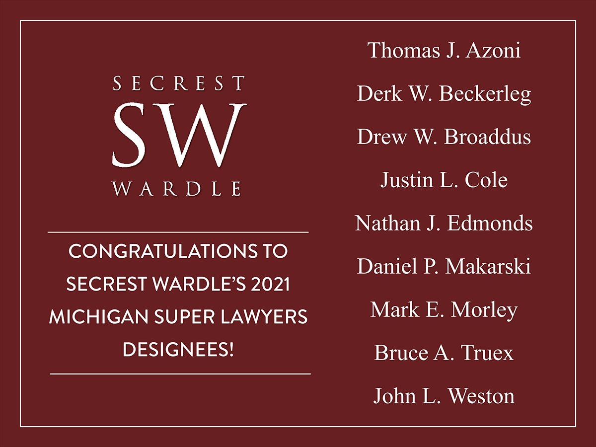 Secrest Wardle is pleased to announce that nine attorneys have been named by Super Lawyers magazine to the 2021 Michigan Super Lawyers list. Super Lawyers is a rating service of outstanding lawyers who have attained a high degree of peer recognition and professional achievement. The selection process includes independent research, peer nominations and evaluations. No more than 5 percent of each state’s attorneys are recognized on the Super Lawyers list.