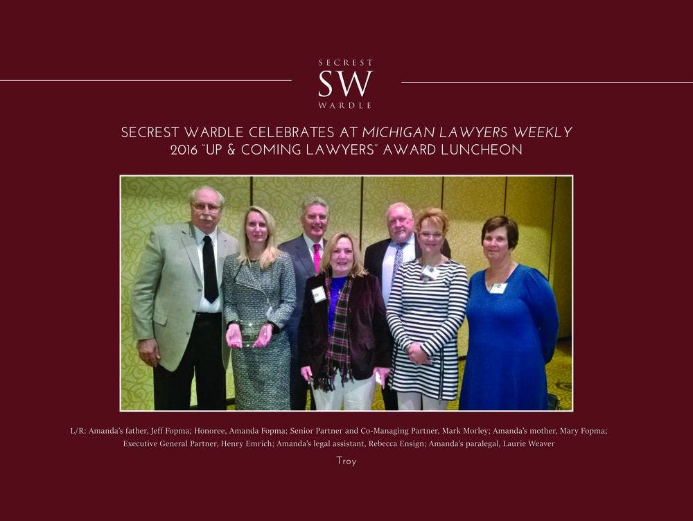 On December 1, 2016, Michigan Lawyers Weekly presented the Class of 2016 "Up & Coming Lawyers" at an awards luncheon that took place at the Detroit Marriott located in Troy. Secrest Wardle Partner Amanda Fopma of the Firm's Grand Rapids office was named to the list of 30 honorees. In attendance from Secrest Wardle were Senior Partner and Co-Managing Partner Mark Morley; Executive General Partner Henry Emrich; Senior Partner, Daniel Makarski; Senior Partner, Nate Edmonds; Executive Partner, Margaret Scott; Amanda’s legal assistant, Rebecca Ensign; Amanda’s paralegal, Laurie Weaver; Marketing Coordinator, Linda Willemsen; Amanda’s mother, Mary Fopma; and Amanda’s father, Jeff Fopma. Michigan Lawyers Weekly published a piece celebrating the Class of 2016 "Up & Coming Lawyers" which may be viewed here http://bit.ly/2gaZtwa.
