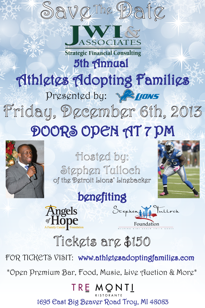 On Friday, December 6, 2013, Stephen Tulloch and friends will team up with Angels of Hope to bring the Southeast Michigan business community together for a special evening, the 5th Annual Athletes Adopting Families for the Holidays event at Tre Monti Ristoranti in Troy, MI (1695 East Big Beaver Road) from 7-11pm. Tickets are $150 each and include premium open bar, dinner and desserts.