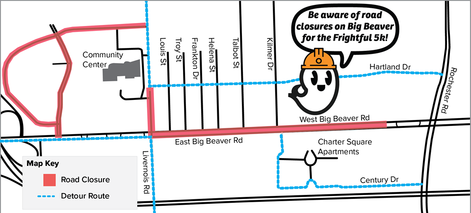 TROY, MI — Parts of East Big Beaver and Livernois Roads will be closed for a few hours Sunday for the Frightful 5K run in Troy. All area churches, hotels and the Children's Hospital will be accessible.