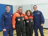 Then it was time to go back inside, where Marine Science Technician (MST1) Cody Mclaughlin, MST2 Tyler Smith and Operations Specialist (OS2) Emily Muhlenbeck showed students a video about the Coast Guard, and did a hands-on learning demonstration of their complex protective uniforms by asking Leonard teachers Dave Russo and Lisa Carruthers to try the outfits on. With assistance, of course.