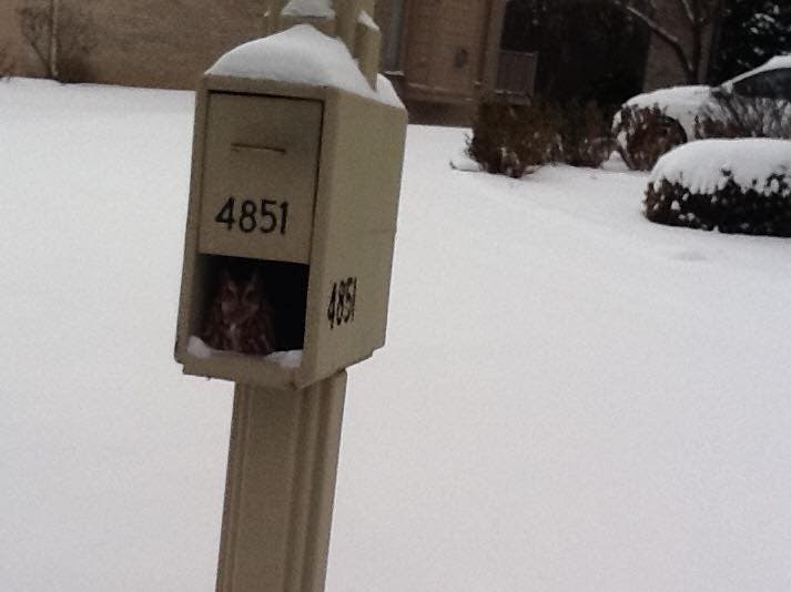 An owl sought refuge from the cold in a West Bloomfield mailbox. (Photo via WXYZ-TV journalist Jeff Vaughn’s public Facebook page)