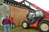 The Barn's new wall structures will soon support new overhead rafters and eventually allow roofing to be completed. This will begin a process of gradually closing up the building to prevent weather damage. Volunteers applauded as the first new wall was set into place.