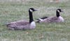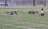 Three geese were gobbling up the grass.