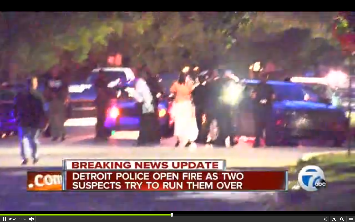 PHOTO: Detroit police had to ask for help from another unit to disperse an unruly crowd at Berkshire and Nottingham, where police shot at two suspects they said tried to run them down in an SUV. One of the men in the crowd allegedly began comparing the incident to a deadly police shooting in Ferguson, MO, where an unarmed black teen was shot and killed. (Screenshot: WDIV video)