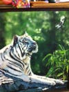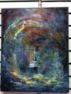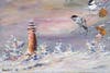 The piece that shares the title of the show is the first time the two artists have collaborated. It features a winter scene. The lighthouse is painted by Kuschel and the birds in the foreground are by Byrum.