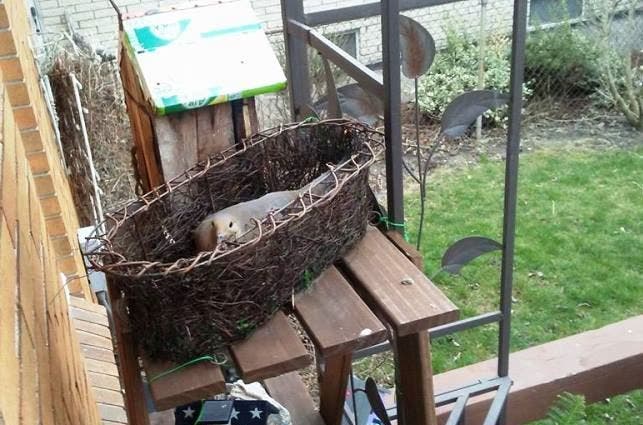 So, this is probably why Mama Mourning Dove misappropriated Marge’s empty mesh wire planter, as a safe haven to lay her eggs, keep them warm and await the hatching of her brood. Marge was ecstatic, and, in researching Mourning Dove breeding habits, Marge discovered, that after the eggs were laid, both Mama and Papa Dove take turns incubating the eggs. Papa takes the day shift; Mama pulls the all-nighter. While their mate is keeping the eggs warm, the other is out foraging for food. Marge sent me this picture of the Mourning Dove feeling safe in the ornamental basket that is tucked on the top shelf of a wrought-iron gazebo. This might have been Papa pictured above since it was daylight. By Marge’s calculations, the hatching may take place on Good Friday. Precious new life ... just perfect for Spring.