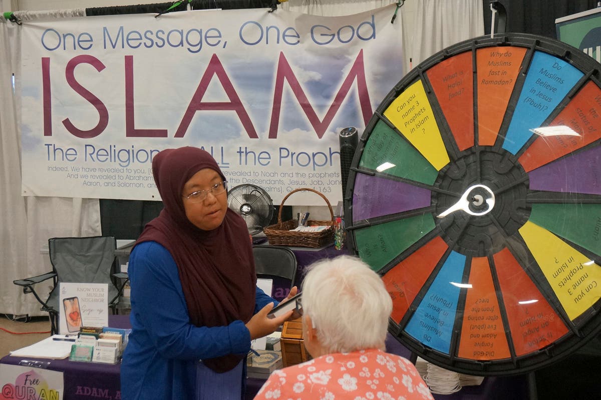 Hamline Church Dining Hall volunteer Sally Johnson walks in front of a prayer sign as she prepares for the breakfast rush on opening day of the Minnesota State Fair in Falcon Heights on Thursday, August 24, 2023. (AP Photo/Giovanna Dell'Orto)Hamline Church Dining Hall volunteer Sally Johnson walks in front of a prayer sign as she prepares for the breakfast rush on opening day of the Minnesota State Fair in Falcon Heights on Thursday, August 24, 2023. (AP Photo/Giovanna Dell'Orto)Jim Zieba pours Swedish egg coffee at the Salem Lutheran Church Dining Hall – one of two remaining faith-based food concessions – minutes before the opening of the Minnesota State Fair in Falcon Heights on Thursday, August 24, 2023. (AP Photo/Giovanna Dell'Orto)Volunteers bow their heads as Salem Lutheran Church pastor Eric Hoffer, not pictured, offers a prayer before the opening of the dining hall the church operates at the Minnesota State Fair in Falcon Heights on Thursday, August 24, 2023. (AP Photo/Giovanna Dell'Orto)Building Blocks of Islam volunteers Mashood Yunus, seated, and Mahmoud Jawara pray in an upstairs room in the education building where their booth operates during the Minnesota State Fair in Falcon Heights on Thursday, August 24, 2023. Yunus helped start the organization to combat misinformation about Islam. (AP Photo/Giovanna Dell'Orto)A line for breakfast runs down the block outside the popular Hamline Church Dining Hall on the opening day of the Minnesota State Fair in Falcon Heights, Minnesota. (AP Photo/Giovanna Dell'Orto)Kolby "Jack Cheese" Peters, a 17-year-old Lutheran from Minnesota's West Otter Tail County, wears a cross over his T-shirt in the swine barn where he shows his crossbred Hampshire hog during the Minnesota State Fair in Falcon Heights, Minnesota. (AP Photo/Giovanna Dell'Orto)Building Blocks of Islam volunteer Sia Lao hands a free copy of the Quran to a visitor at the group's booth in the education building of the Minnesota State Fair in Falcon Heights. (AP Photo/Giovanna Dell'Orto)Aliza Lamprecht, 7, holds on to a new illustrated Bible she received at the Crossroads Chapel tent before going to volunteer with her family at the cattle barn during the Minnesota State Fair in Falcon Heights. Faith has a deep-rooted, crucial presence at the fair, from the evangelical chapel handing out thousands of free Bibles to a booth seeking to combat misinformation about Islam and decades-old Lutheran and Methodist dining halls. (AP Photo/Giovanna Dell'Orto)Jeff Knott sprays Lil' Red with water as his daughter, Marin Knott, 16, leads the pig and her sister, Elsie Knott, 13, looks on during the Minnesota State Fair in Falcon Heights, Minnesota. The devoted Lutheran family likes to patronize the Hamline Church Dining Hall during their stay at the fair, as earlier generations have done when church dining halls were the mainstay for farmers gathering from across the state. (AP Photo/Giovanna Dell'Orto)The Rev. Mariah Furness Tollgaard of Hamline Church works at the to-go counter at the Methodist church's dining hall during the Minnesota State Fair in Falcon Heights, Minnesota. Finding volunteers for the hundreds of shifts at the popular diner has become a challenge even for this iconic dining hall, founded in 1897. (AP Photo/Giovanna Dell'Orto)Two fairgoers walk their sheep on the opening day of the Minnesota State Fair in Falcon Heights, Minnesota on Thursday, August 24, 2023. (AP Photo/Giovanna Dell'Orto)