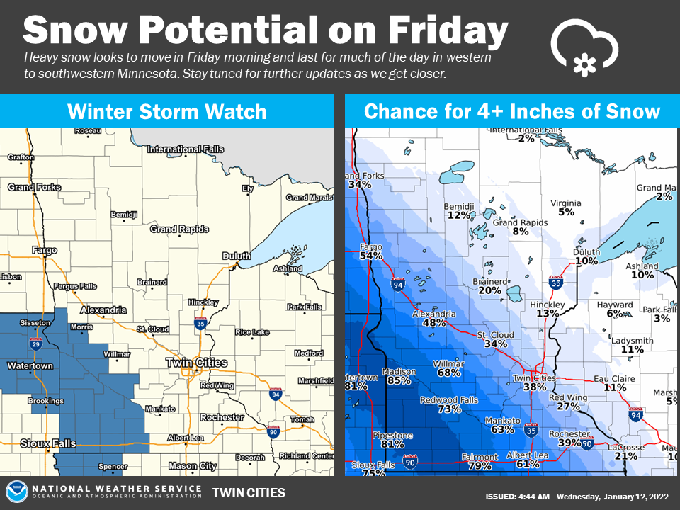 "Snowfall leading to travel impacts is expected in western to southern Minnesota on Friday, beginning during the morning and lasting through the evening," the National Weather Service said.