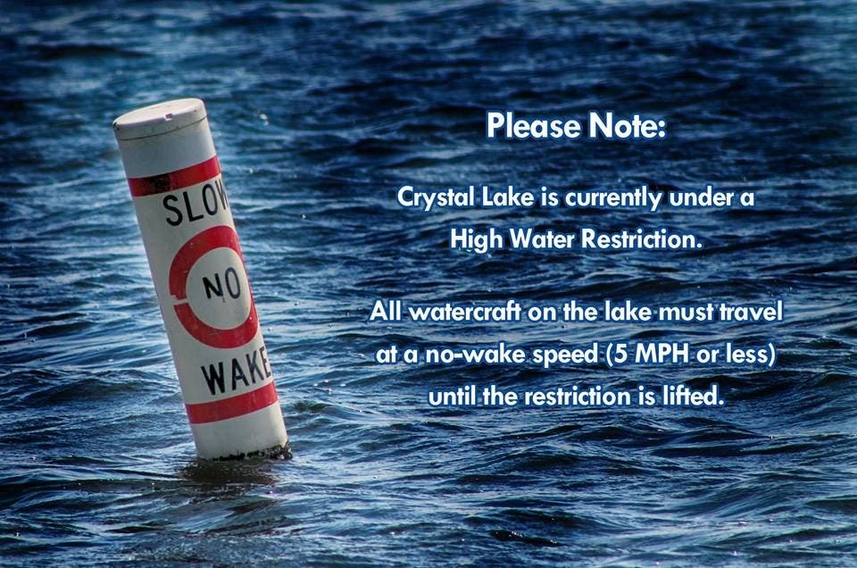 As a result, officials have placed Crystal Lake under high water restriction status. All watercraft on the lake must travel at a no-wake speed of 5 MPH or less until the restriction is lifted.