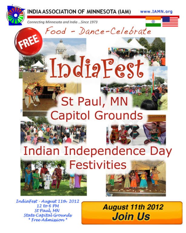 Indian Association of Minnesota (IAM) would like to invite you and your family and friends to join us at IndiaFest 2012, from 12pm - 6pm to celebrate India’s 66th Independence Day.
