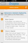 Happy hour check-ins receive one free happy hour item (except the cheeseburger), while the Mayor of McCormick & Schmick's gets one free dinner entree with the purchase of another of equal or lesser value.