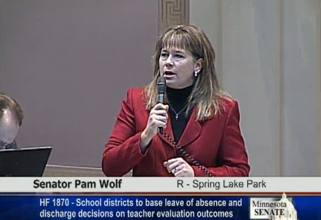 Updated below. State Sen. Pam Wolf (R-51) said Tuesday she felt "frustration" and saw "cruel irony" in after she shepherded a bill changing teacher-layoff rules through the Minnesota Legislature this year.