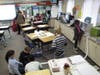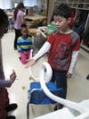 After a brief description and a few notes about force, Joy’s class constructs their own roller coasters out of foam. The class is broken into teams, given a marble, foam tubes and plenty of tape to make a roller coaster of their own design.