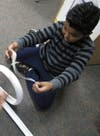 James Carothers and Holden Mattoon bend their foam pieces creating what they called “loopty loops” in their roller coaster. After taping a series of foam pieces together, they drop a marble through the creased foam to see if their design works.