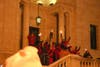 As the legend goes, on the tenth day of the Winter Carnival Vulcanus Rex and his Krew storm the castle and are held off by the King's guards. Upon counsel of the Queen, Boreas bids farewell to the people of his winter capitol and returns to Olympus. After the parade, the Vulcan overthrow is where this part of the story comes to life, and my Princess and I had front row seats from the South Wind bus. The Royal family stood on the steps of the library as the Vulcans were lead through the streets by their supporters. Once the Krew reached the library they charged the Royal family upon command of their leader. They are held off twice by the King’s guards, but on the third charge the Vulcans break through and the Royal family retreats into the library. Vulcanus Rex once again claims victory with the promise of warmer weather to come. I had never seen this tradition until this night, and it was by far the coolest part of Carnival!!