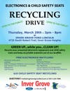 Inver Grove Ford Lincoln will be hosting a “GREEN UP while you CLEAN UP” recycling drive at its dealership on Thursday, March 29, 2012 from 3pm to 8pm. The recycling event is open to the public and gives community members an opportunity to recycle old electronics and child safety seats (car seats and booster seats) that are no longer needed.