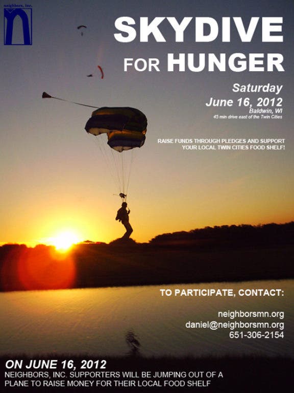 Last year, more than two dozen people skydived for Neighbors and raised a considerable amount of money for the food shelf. The response last year was so positive, that Neighbors is excited to announce the second Skydive for Hunger event on Saturday, June 16 in Baldwin, WI. Daniel Zhu, Communications and Event Manager for Neighbors said, ". . .By joining Neighbors and taking part people will be able to help fund their local food shelf in a fun, exciting, and adventurous way." Skydiving for many is a once in a lifetime event that people look back on with a real sense of achievement.