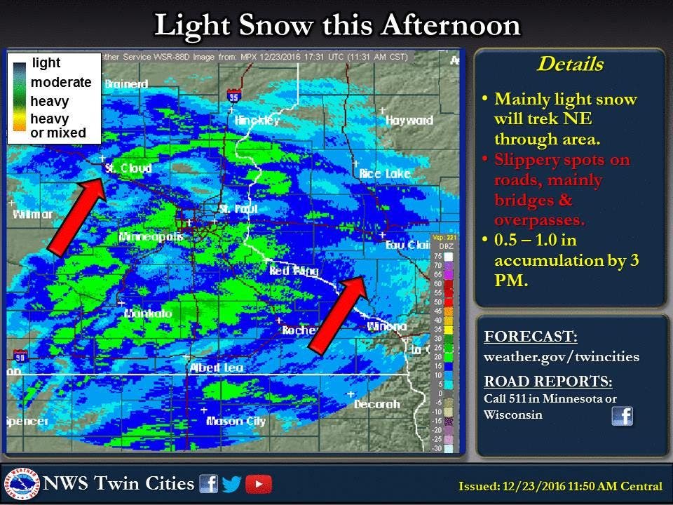 Snow will develop Friday morning and taper off in the early evening. Snowfall amounts of two to four inches are expected from Fairmont to Red Wing and Eau Claire on eastward.