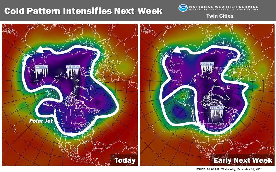 The cold air in the Twin Cities will intensify early next week as the core of the arctic air slides into Canada.