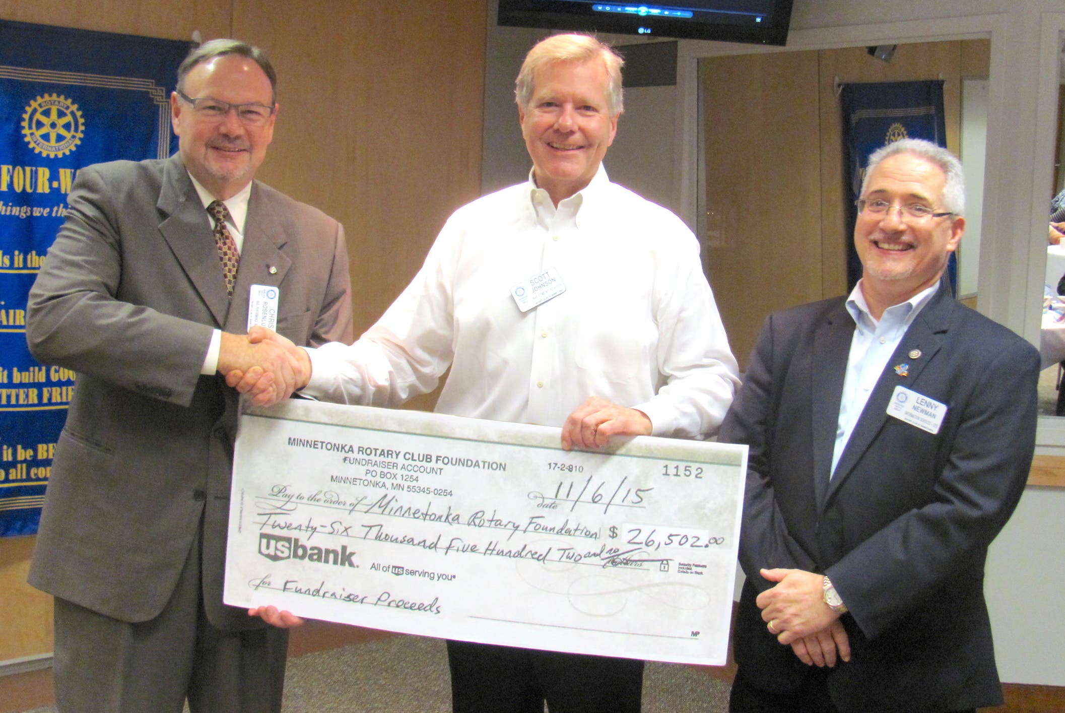 Pictured here are Minnetonka Rotary Foundation Chair: Chris Rosenlund, Fundraiser Chair Scott Johnson, and Minnetonka Rotary President Lenny Newman with a big check transferring the money to the Minnetonka Rotary Foundation.