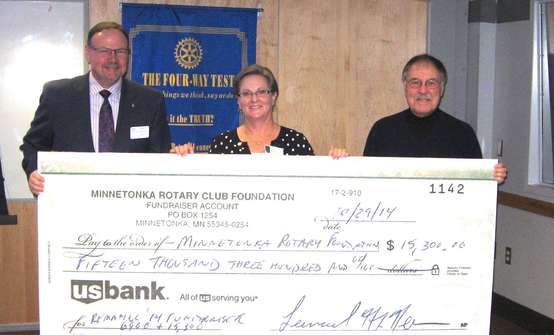 President Chris Rosenlund, Fundraiser Chair Ann Wengronowitz, and Minnetonka Rotary Foundation Treasurer Bill Yaeger are pictured