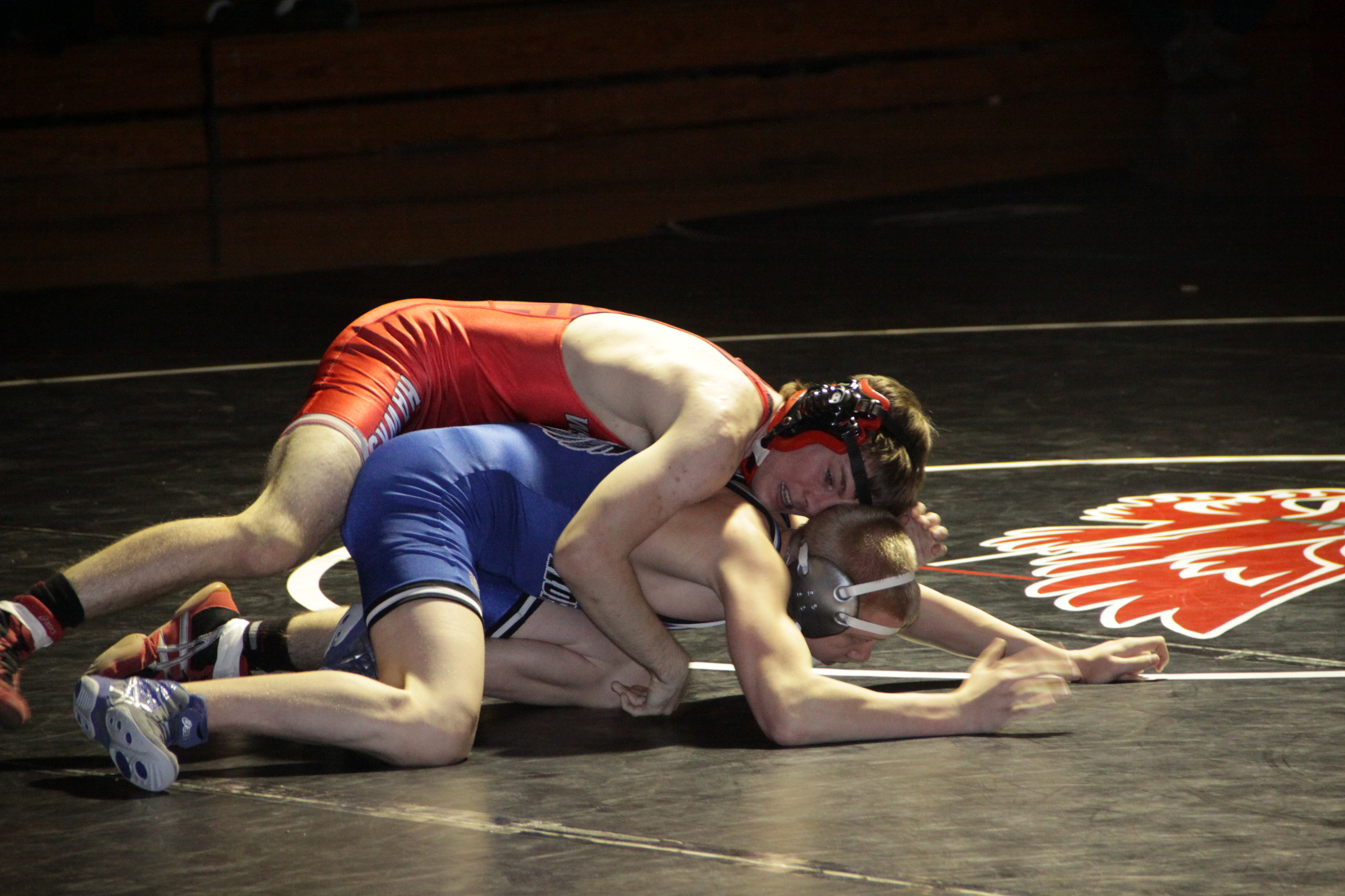 On Friday, January 24, the White Hawks wrestling program hosted a huge night, as it was Senior Night, Link Night and TakeDown Cancer Night when the White Hawks faced the Hopkins Royals. White Hawks seniors Bryan Tierney, Ryder Schmidt, John Byers, Adrian Wear, Bricen Rasmussen, and Travis Peterson and their parents were honored before the dual. The MWHS Link Crew leaders were in attendance with their 8th and 9th grade mentees, and there were several fund raising and awareness activities to celebrate TakeDown Cancer, a fund raising effort for the Randy Shaver Cancer Research and Community Fund. The huge night came together in a big way, as the White Hawks dominated in front of a packed house. “It was a great night for the kids, and fun to see them perform well in front of a big crowd,” commented assistant coach Eric Rodelius . All of the seniors who wrestled won their matches, but none was bigger than senior Adrian Wear, who blanked his opponent 12-0 in front of his fellow Link Crew members. “Adrian is the ultimate team guy, and it was great to see him get a big win in his last home dual meet,” added assistant coach Jake Saatzer