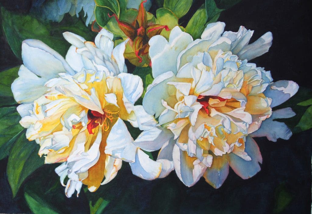 The artist, known for her sensory style that draws the viewer in with an alluring tactual appeal, depicts nature with curiosity and depth through her intricate study of light, reflections and shadows. "It was a pleasure to award Kathy Miller's "White Peonies" Best of Show at the Minnesota Watercolor Society Spring Juried Exhibition,” said Megan Rye, the exhibit judge. “It is a well-established tradition to paint flowers, especially in the medium of watercolor. Kathy's approach honors this tradition, but also springs forth with dazzling life, and a relevancy that is freshly observed. "White Peonies" grabbed my heart and wouldn't let go.”