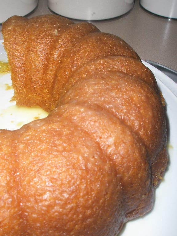 Mix together glaze ingredients and boil for 2 minutes. Pour glaze over cake while hot. Let cool. Turn out out onto platter.