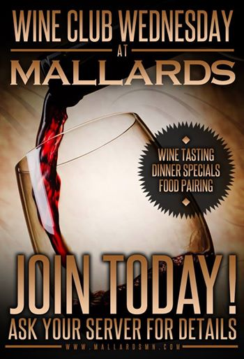 Every Wednesday starting at 6:00 pm we will be sampling 5 to 6 wines and food from different regions around the world each month. For more details visit www.mallardsmn.com