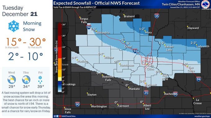 TWIN CITIES, MN — Residents of the Twin Cities can expect light snow during their commutes Tuesday morning. Hennepin, Anoka, Ramsey, Dakota, Scott, and Washington counties are among those under a hazardous weather outlook.