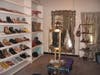 Trendy shoes for men and women line shelves that hover overhead. Standing to the left of a picture of rapper Trina, contemporary earrings and sunglasses Bross explains,