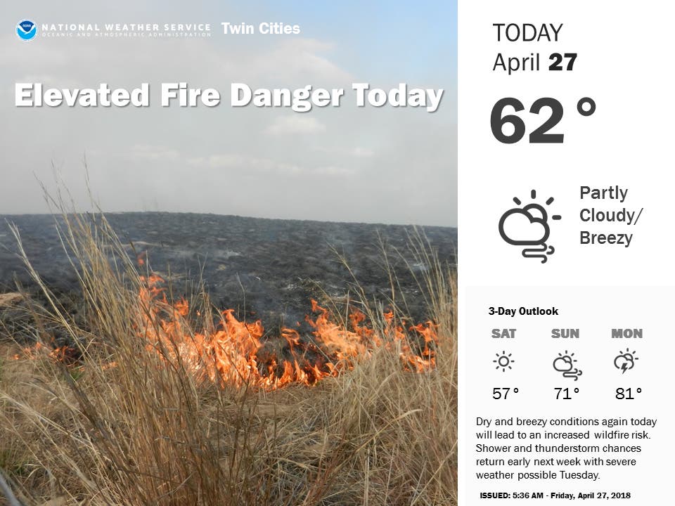 TWIN CITIES, MN — High fire danger will continue Friday with gusty winds and low humidity. After a cool Saturday, the weather will flip to summer early next week with temperatures warming into the 70s and 80s Monday and Tuesday with increasing humidity.