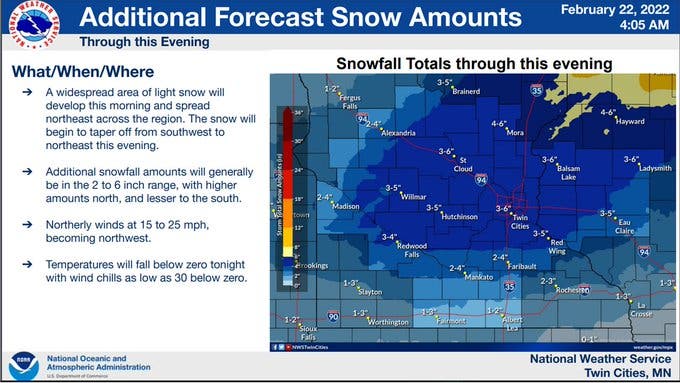 TWIN CITIES, MN — Between 3 and 6 inches of snow will fall by Tuesday night in the Twin Cities, according to the National Weather Service.