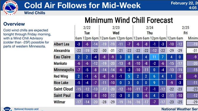 "The lowest wind chill values will occur over west central and central Minnesota where readings could drop as low as -30F."